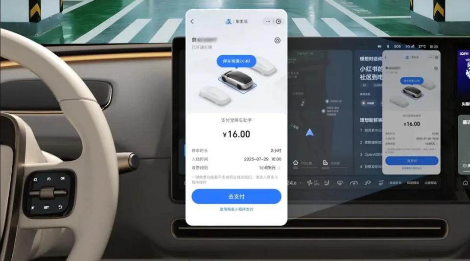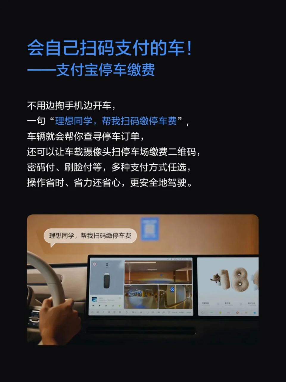 要缴费时,手机无用掏,场地盘无用动,只需说一句“理念念同学,帮我扫码缴一下泊车资”,车机自动叫醒「支付宝车载助手」。