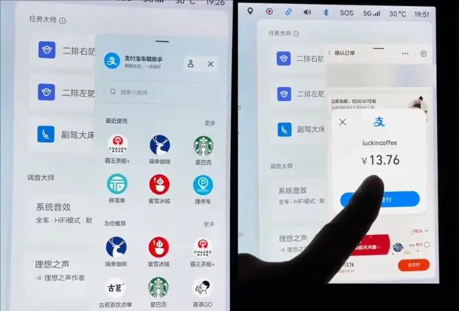 去到跟支付宝有相助的餐厅,把菜单同步到车载系统,下车吃完就走,回到车上在支付宝车载助手上买单支付。