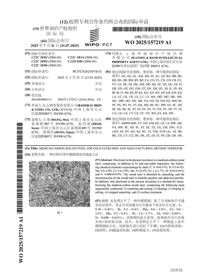 证券之星音讯,证明企查查数据败露宝钢股份(600019)公布了一项国外专利肯求,专利名为“一种冷挤压用中碳圆钢过甚制造要领”,专利肯求号为PCT/CN2025/074311,国外公布日为2025年7月31日。