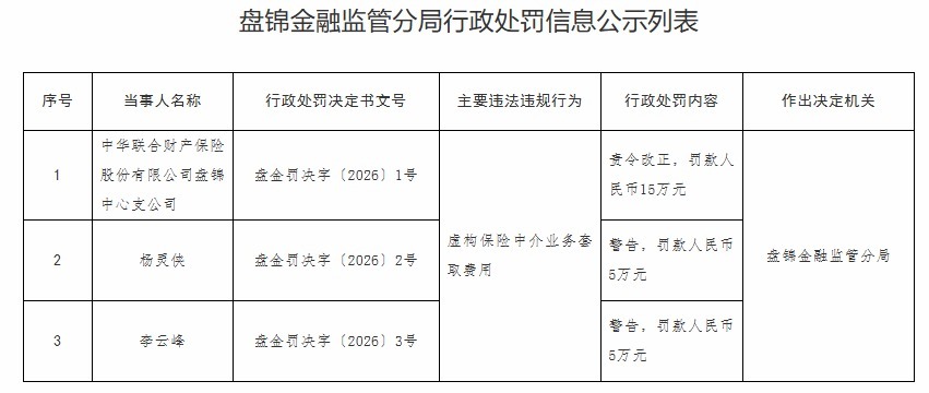 盘锦金融监管分局决定对中华集结财产保障股份有限公司盘锦中心支公司责令改正,罚金东谈主民币15万元;对杨灵侠处以告诫,罚金东谈主民币5万元;对李云峰处以告诫,罚金东谈主民币5万元。