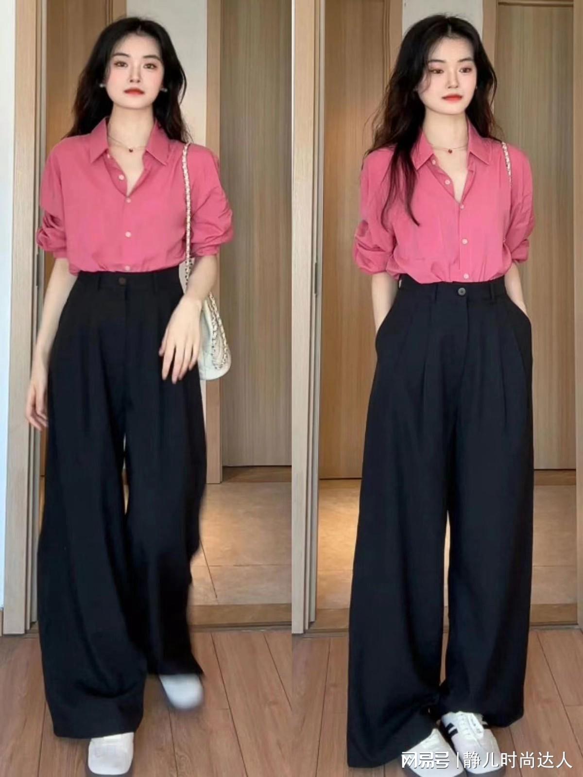 上衣搭配一条玫红色的衬衫,衬得女生的肤色愈加白净,春季衬衫和阔腿裤的组合穿搭给你不相通的簇新当然感哦。