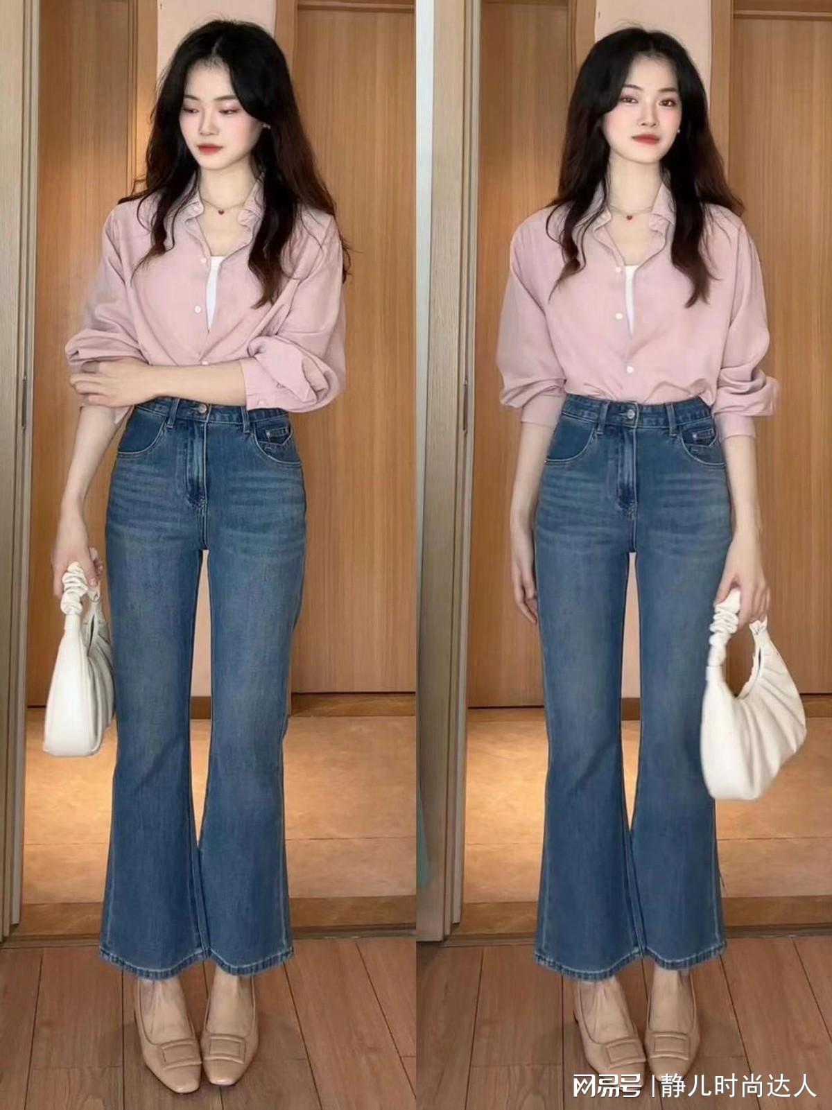 上衣搭配一件粉色衬衫,将衬衫的衣角扎进牛仔裤内部,显得女生总计躯壳线条都特别面子,既甜好意思又性感。
