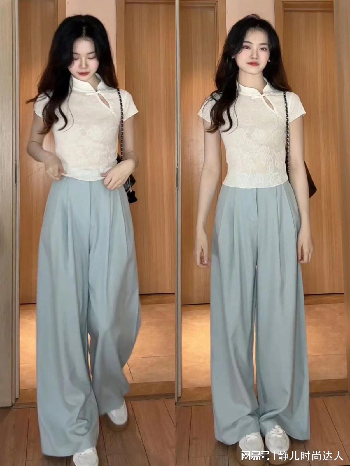 T恤衫具备是本年十分流行的中国风单品,搭配一条雾霾蓝色的阔腿裤,连合了东方传统文化与当代先锋,很好的提高了女生的气质感。