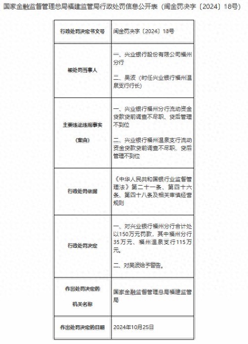 11月1日音讯,国度金融监督处置总局福建监管局近日公布的行政处罚信息清楚,兴业银行股份有限公司福州分行十分下属温泉支行因在流动资金贷款业务中存在贷前探听不守法和贷后处置不到位的问题,被处以揣摸打算150万元的罚金。其中,福州分行被罚金35万元,福州温泉支行被罚金115万元。