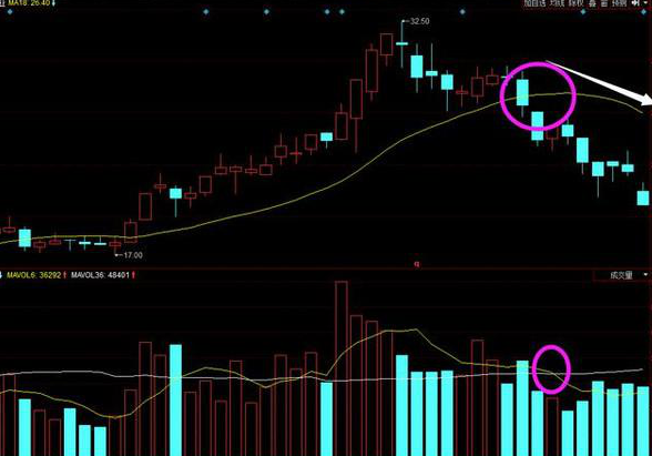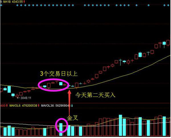 1.波段买入:股价不才跌趋势中,K线梁旭三天收盘价站上18日均线,何况18日均线走势由向下转为进取,同期量能的扶助6 日均线 金叉36日均量,则为买入信号 ,第四天开盘就可买入。如下图: