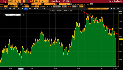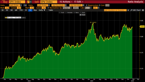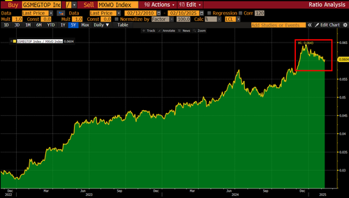 自2022年11月股市触底以来,Mag7的相对强度(对比MSCI环球指数)初次露出疲态:标普500等权重指数的相对上风于昨年7月见顶。